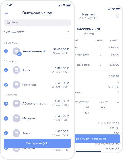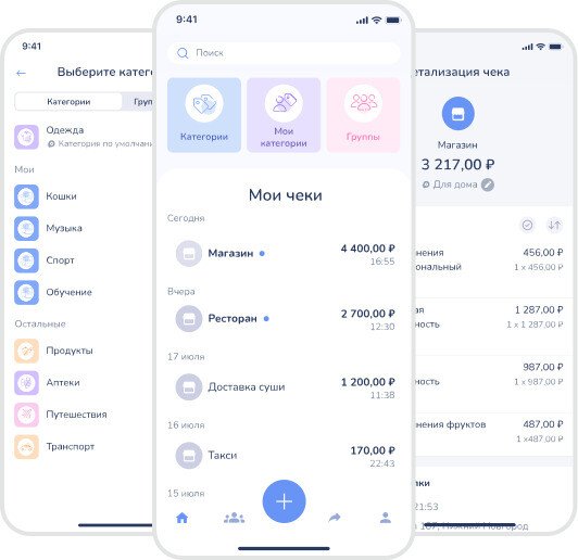 - Поиск: поиск по категориям и товарам помогает быстро находить чеки.