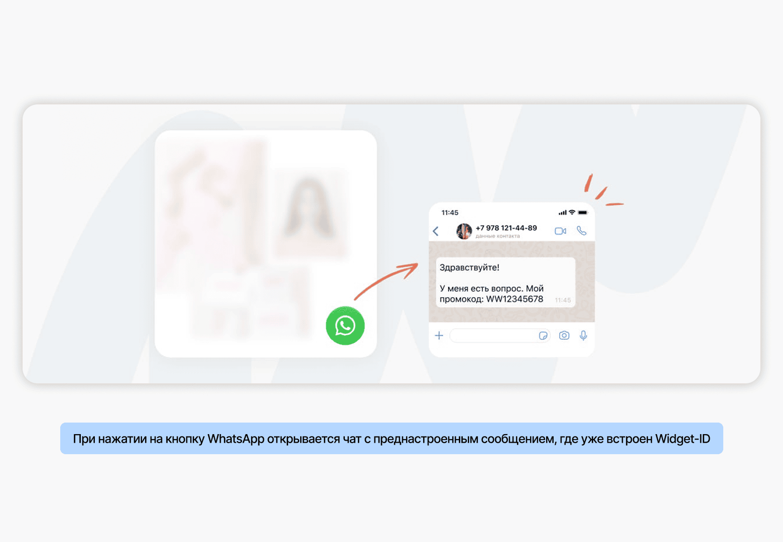 - При переходе в WhatsApp предзаполненное сообщение уже содержит этот ID.