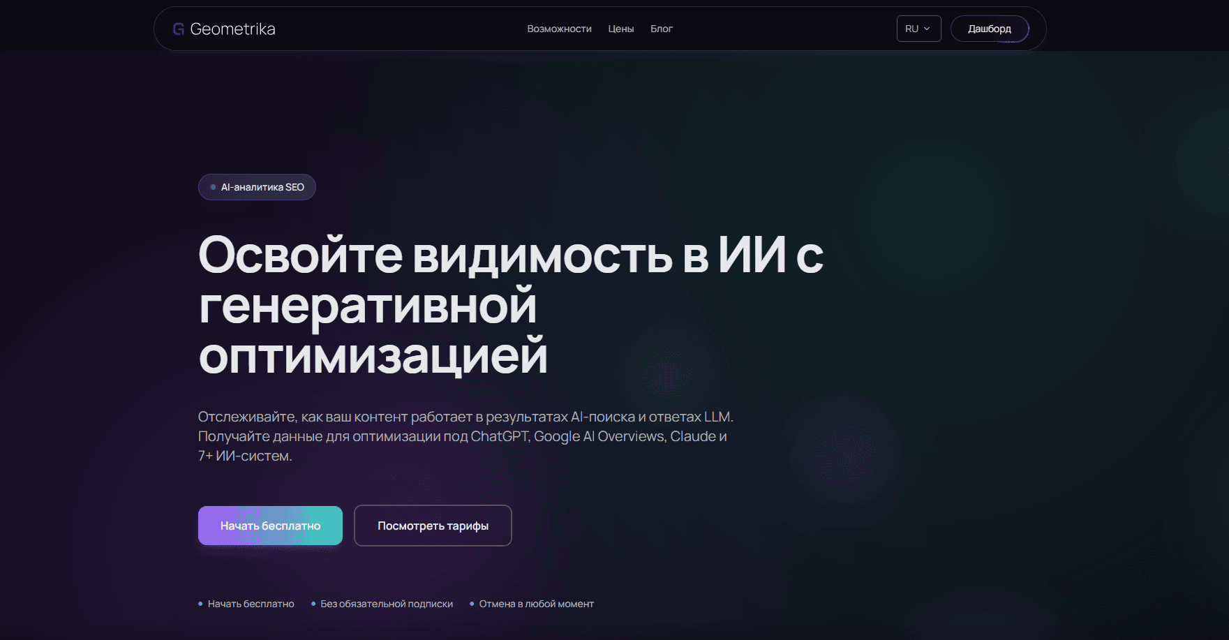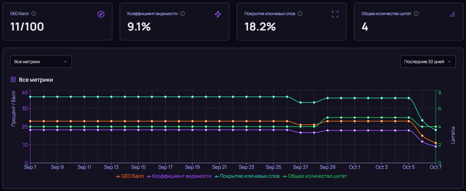 Geometrika — это первая в России система мониторинга и анализа реальной видимости бизнеса в генеративных ответах ИИ. Позволяет отслеживать, как бренд представлен в ответах ChatGPT, Яндекс Нейро + Алиса, Google AI Overviews, Grok, Perplexity и Gemini, чтобы управлять репутацией компании, расширять каналы продаж и внедрять эффективную GEO-стратегию.