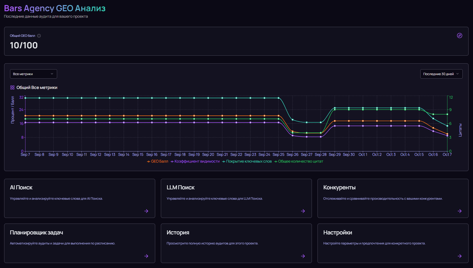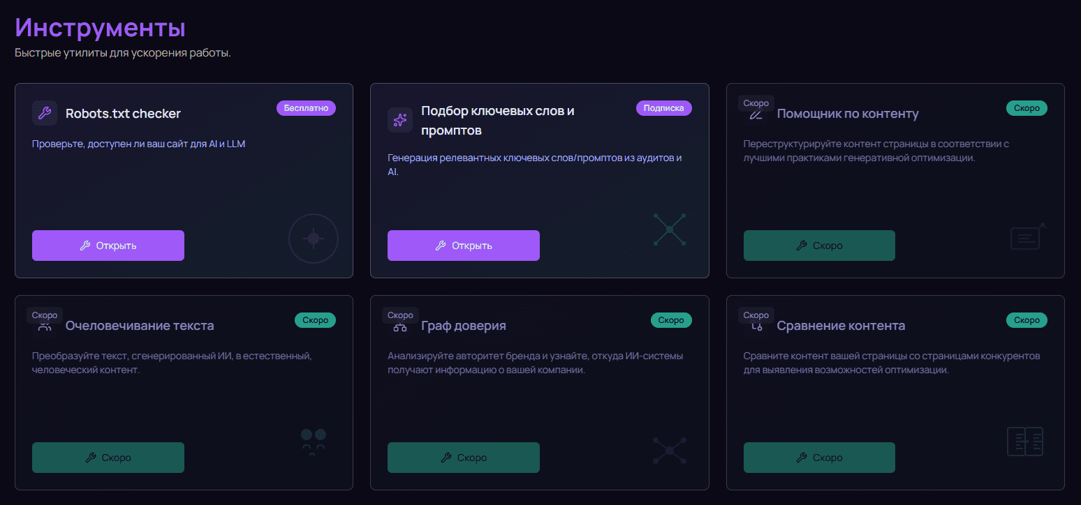 - SEO- и GEO-специалисты, как профессиональный инструмент для мониторинга, анализа и построения отчетов по эффективности Generative Engine Optimization.